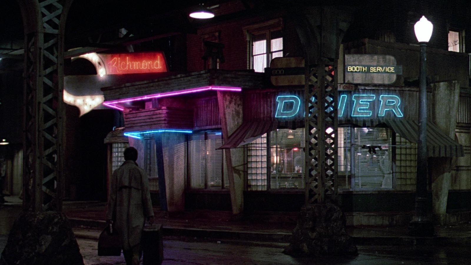Entre todos estos y muchos más ejemplos, Calles de fuego (Walter Hill, 1984), de mano del director de Los amos de la noche y co-guionista no acreditado de Alien, el octavo pasajero (Ridley Scott, 1979), parece haberse convertido en un ejemplar de segunda fila, mientras que no deja de ser encantadoramente original y extraña y sin duda pionera en la estética que arrasaría en los años ochenta. La película ya resulta bastante surrealista desde su escena inicial, en la que una banda descontrolada de moteros se lanza al escenario en pleno concierto para secuestrar a la cantante de una banda de rock, Ellen Aim (Diane Lane), y llevársela a su lado chungo de la ciudad. Pronto vuelve al pueblo Tom Cody (Michael Paré), el ex-novio guaperas de Ellen, y evidentemente tarda poco en montar una escuadrilla armada y lanzarse al rescate de su antiguo amor. Calles de fuego entonces se desenvuelve como un wéstern post-apocalíptico en el paisaje industrial de trenes aéreos y calles desoladas en el que, aunque intencionadamente nunca se indica, es fácil reconocer la decadente figura de Nueva York.