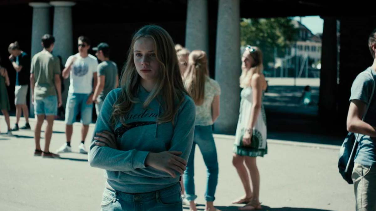 Se trata de una historia que va mucho más allá de retratar una adolescencia agónica con serios problemas para gestionar los cambios en el propio cuerpo, sumada a la sensación permanente de incomprensión y la amenaza latente del bullying, sobre todo para quien se incorpora tarde a un entorno hostil. Para más inri, el distanciamiento con los padres y el temor a no ser realmente su hija, dispara todavía más la ansiedad. Este es, a grandes rasgos, el esqueleto de una vida sacada totalmente de la zona de confort de la infancia, que se va por el sumidero, junto a los paisajes amables a los que llamamos hogar. En el nuevo hábitat, todo el metraje se tiñe de persistente azul, que es el color de las penas en las lenguas germanas, y el del cielo reflejándose en el mar que lame las heridas (o el oleaje del lago, a efectos suizos), el dicho metafórico del pez fuera del agua se torna sirena. Y de las fieras, pues entre tanto bello coral, abundan los depredadores y mejor ser tiburón que su merienda.