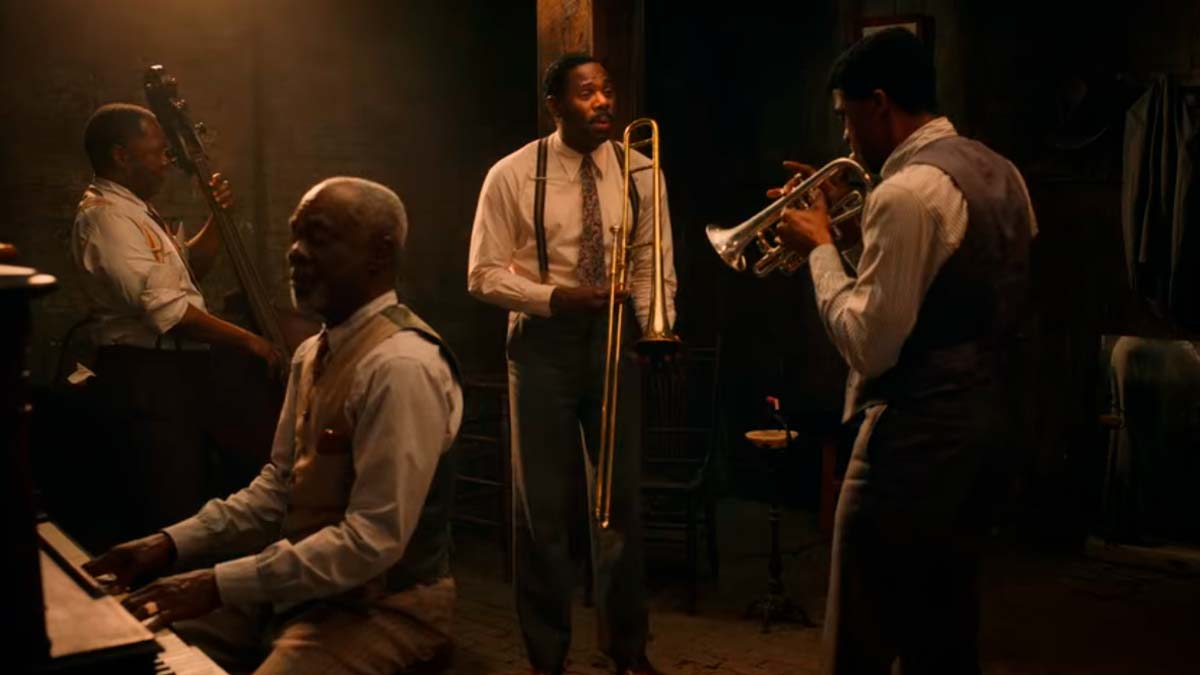 En medio de esta debacle de talento y derechos musicales, una fuerza equiparable a la de Ma pero en dirección opuesta crea el conflicto principal: el trompetista Levee. Interpretado por el tristemente fallecido Chadwick Boseman, este enérgico miembro del grupo acarrea un trauma que puso su mundo patas arriba de pequeño, antes de tener capacidad para entender lo que estaba sucediendo. Esto define todo lo que hace, y lo convierte en una bomba de relojería. Presumido, lleno de confianza y chulería irreverente, mantiene una sonrisa a modo de máscara, hasta que el tedio de tratar con gente que no le comprende hace «clic» y le transforma en un cañón emocional a punto de abrir fuego, disparando la tensión de la escena. Atrapado entre sus intentos de complacer a los blancos para salirse con la suya y la burla de sus compañeros por usar lenguaje propio de un esclavo, toda su picaresca cae en saco roto por su incapacidad para prever las trampas de la explotación de los negocios blancos.