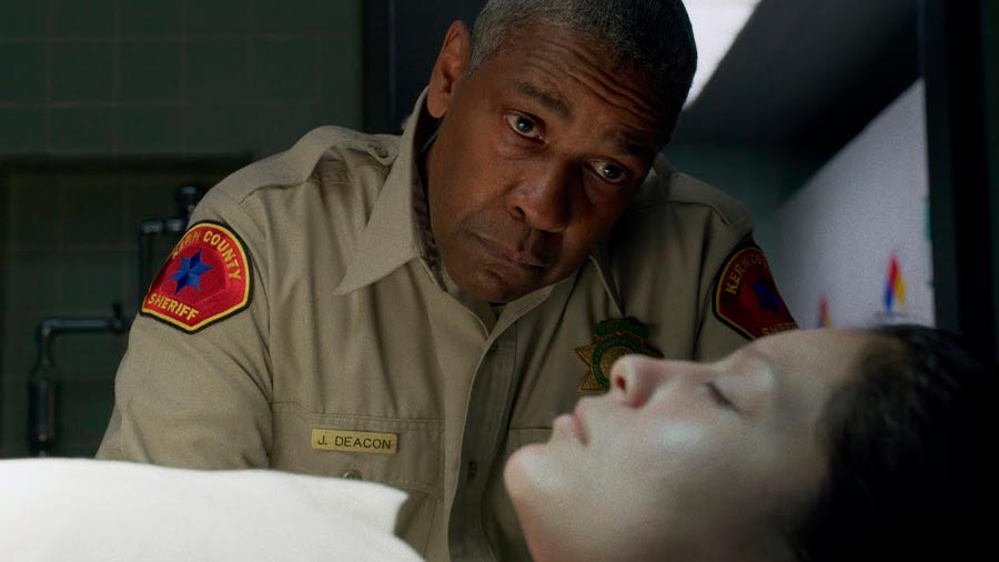 Siguiendo con los regalos visuales de la película, otro de los puntos más remarcables del filme tiene que ver con el sheriff y su obsesión que le lleva incluso a imaginarse las víctimas, pasadas y presentes, y a charlar con ellas de una forma fantasmagórica en su motel. En dicha secuencia el cineasta, ingenioso y clásico, utiliza un iluminación verdosa y oscura —un claro homenaje a Vértigo (De entre los muertos) (Alfred Hitchcock, 1958)— junto con una interpretación desolada de Washington, una bomba de relojería a nivel dramático, mostrando al público otra incógnita del guion sobre el caso que tuvo que resolver hace años y que, entre cadáveres y criminales, siempre vuelve, y como diría el sheriff: «no se acaba nunca».